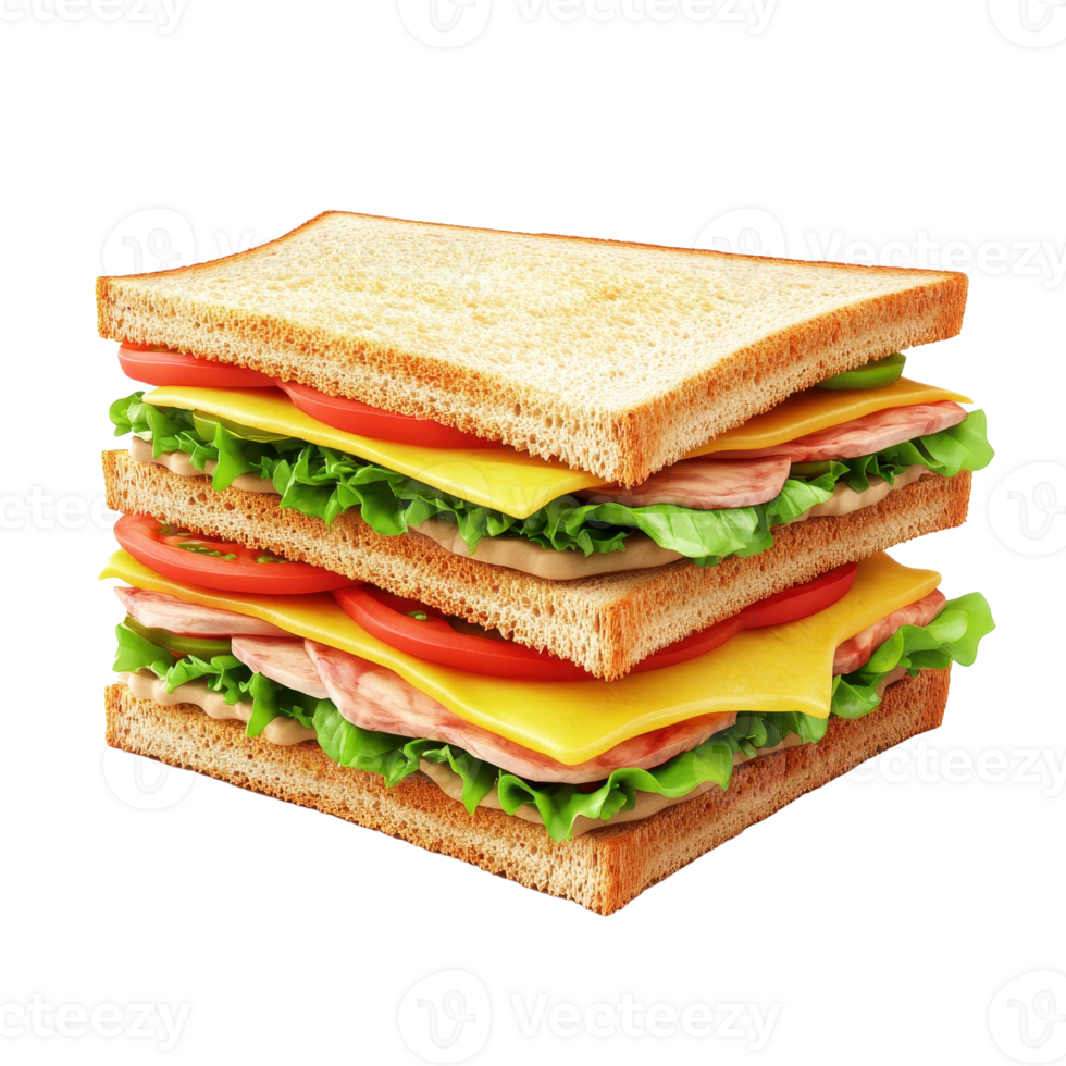 A classic layered club sandwich consists of three slices of toasted bread layered with mayonnaise, cooked chicken or turkey, crispy bacon, lettuce, tomato, and cheese. It is assembled in two layers, secured with toothpicks, and cut into triangles or quarters. Key variations include adding avocado, egg, or mustard.